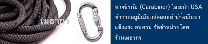 ห่วงนิรภัย (Carabiner) โอเมก้า USA ทำจากอลูมิเนียมอัลลอยด์โดยผ่านกรรมวิธีพิเศษทำให้มีความแข็งแรงทนทานกว่าห่วงนิรภัยที่ทำจากอลูมิเนียมอัลลอยด์ทั่วไป สามารถรับน้ำหนักได้ถึง 22 กิโลนิวตัน (kN) น้ำหนักเบา เหมาะสำหรับใช้งานโรยตัวในที่สูง สามารถใช้งานกับเชือกโรยตัวสวอนได้เป็นอย่างดี