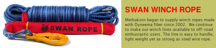 เชือกทำวินส์สำหรับรถ 4x4 ผลิตจากเส้นใยไดนีม่า SK 75 100% ประกอบด้วยน้อตยึดวินส์และห่วงถักสำหรับใส่ตะขอเกี่ยว ขนาดเส้นผ่านศูนย์กลางเชือกอยู่ที่ 8 มม. รับแรงดึงสูงสุดได้ที่ 4,677 กก. หรือประมาณ 10,000 ปอนด์ ชุดเชือกวินส์มีความยาวทั้งสิ้น 30 เมตร และมีเชือกถักแบนสำหรับป้องกันการเสียดสีความยาว 2 เมตรให้ด้วย ราคาชุดละ 4,800 บาท มีคุณภาพทัดเทียมกับของที่ผลิตในยุโรปและอเมริกา มีจำหน่ายที่ร้านเมธากร
